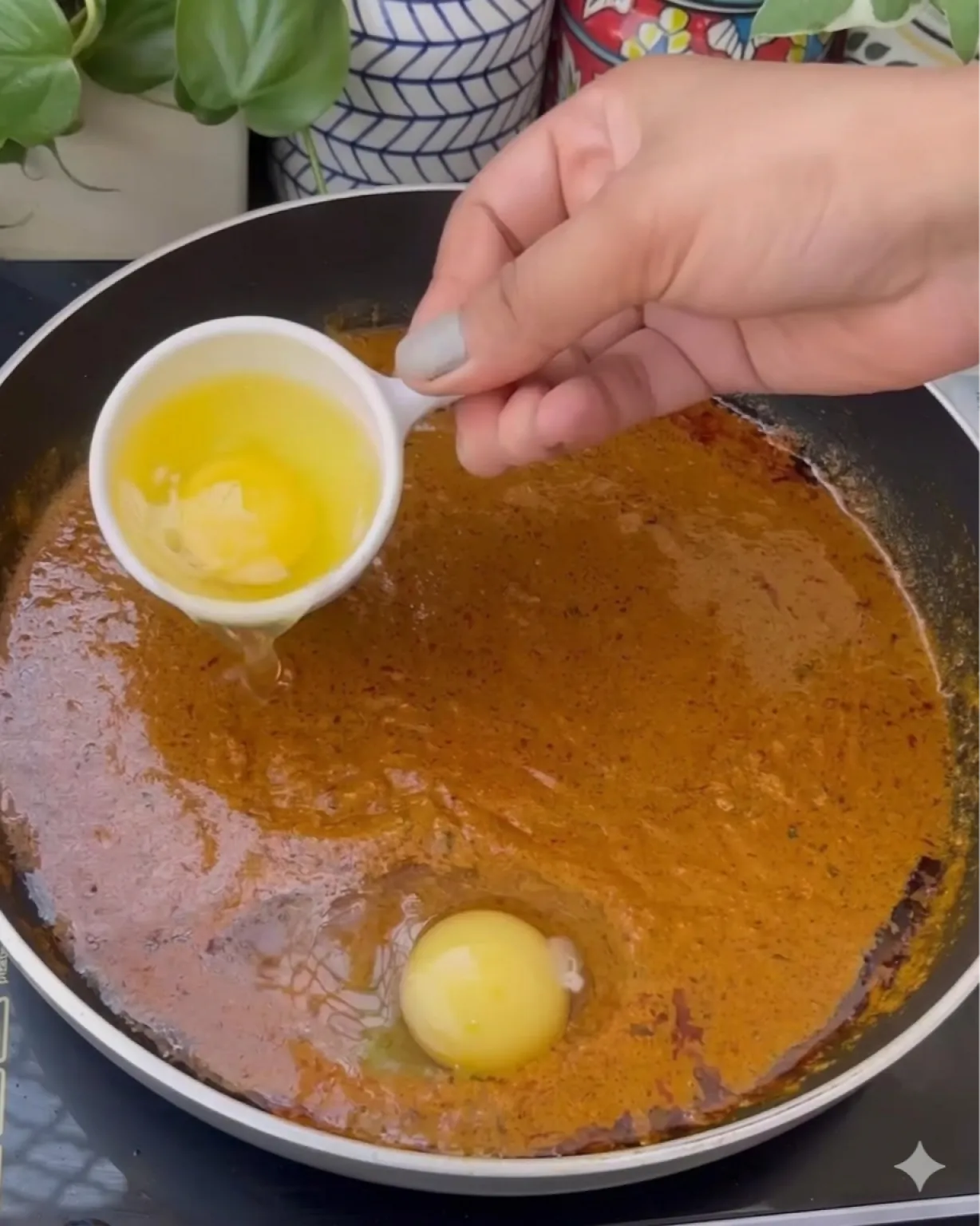Lorsque le curry est cuit, faites 4 puits pour déposer les oeufs au milieu du curry.