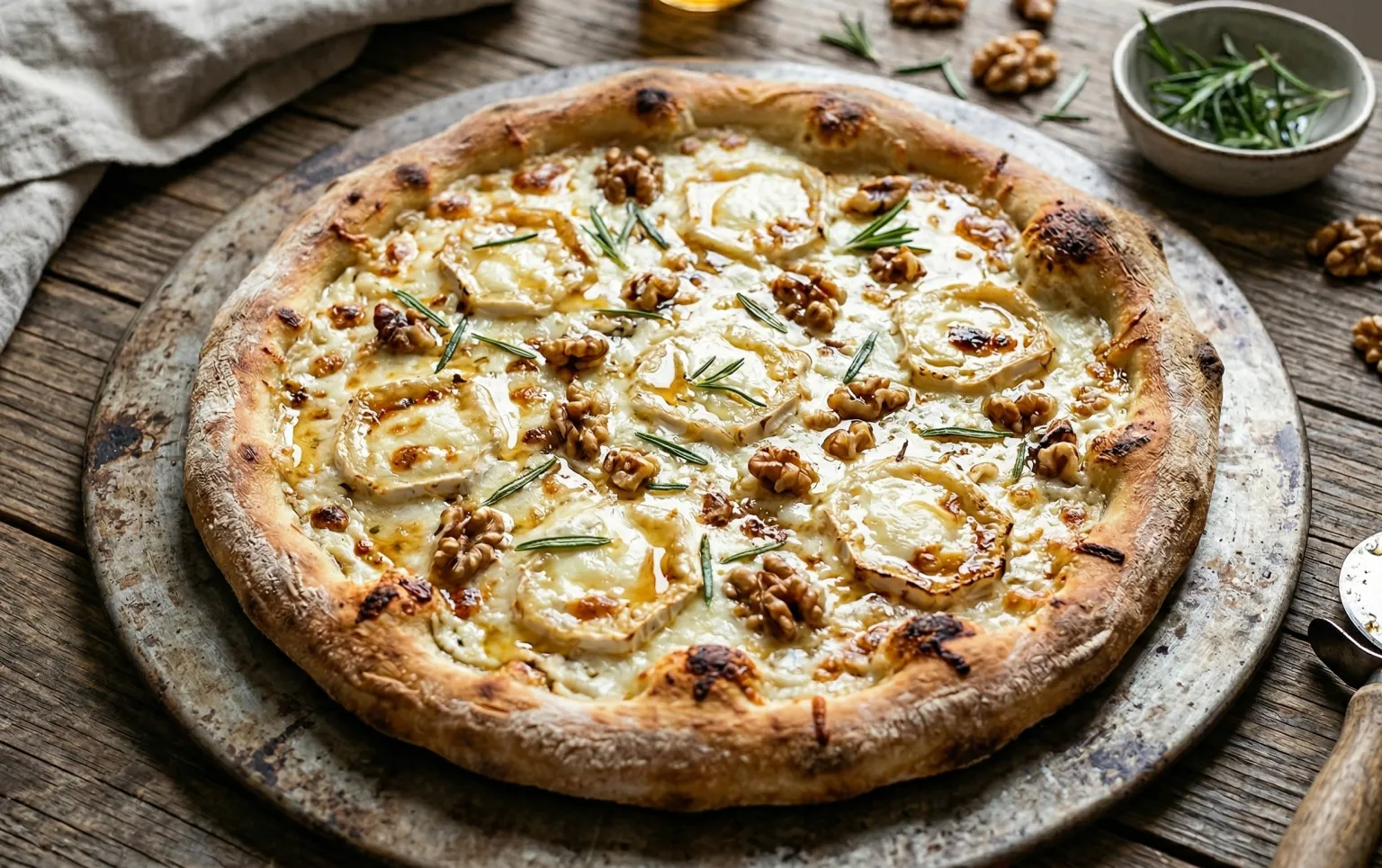 Succombez au mariage parfait du sucré-salé avec cette pizza artisanale. La douceur du miel de fleurs rencontre le caractère du fromage de chèvre fondant, sublimée par le croquant des noix et le parfum boisé du romarin frais.